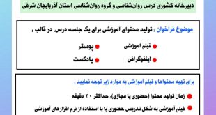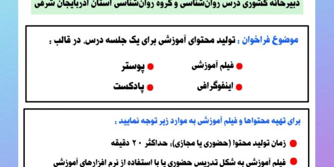 دبیرخانه کشوری درس روانشناسی و گروه روانشناسی استان آذربایجان شرقی برگزار می کند : 🔔فرخوان تولید محتوای آموزشی با محوریت هوش مصنوعی 📎در قالب فیلم پوستر و.اینفو گرافیک و پادکست 📆مهلت ارسال : ۲۰ دی ۱۴۰۴ 📬نحوه ارسال: از طریق سامانه شاد به آی دی : @jbmlsq7319 یا از طریق ایمیل به آدرس: Azarpsy89@gmail.com جدول تقسیم بندی درس۲جهت فراخوان کشوری …