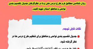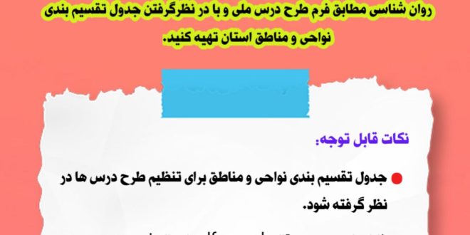 گروه روانشناسی استان آذربایجان شرقی برگزار می کند : :bell: فراخوان طرح درس نویسی از مباحث کتاب روانشناسی پایه یازدهم :paperclip:در قالب word یا pdf :calendar:مهلت ارسال : ۳۰ آذر ۱۴۰۴ :mailbox_with_mail:نحوه ارسال: از طریق سامانه شاد به آی دی : @jbmlsq7319 یا از طریق ایمیل به آدرس: Azarpsy89@gmail.com جدول تقسیم بندی نواحی و مناطق ویژهفراخوان طرحدرس نویسی نواحی و …